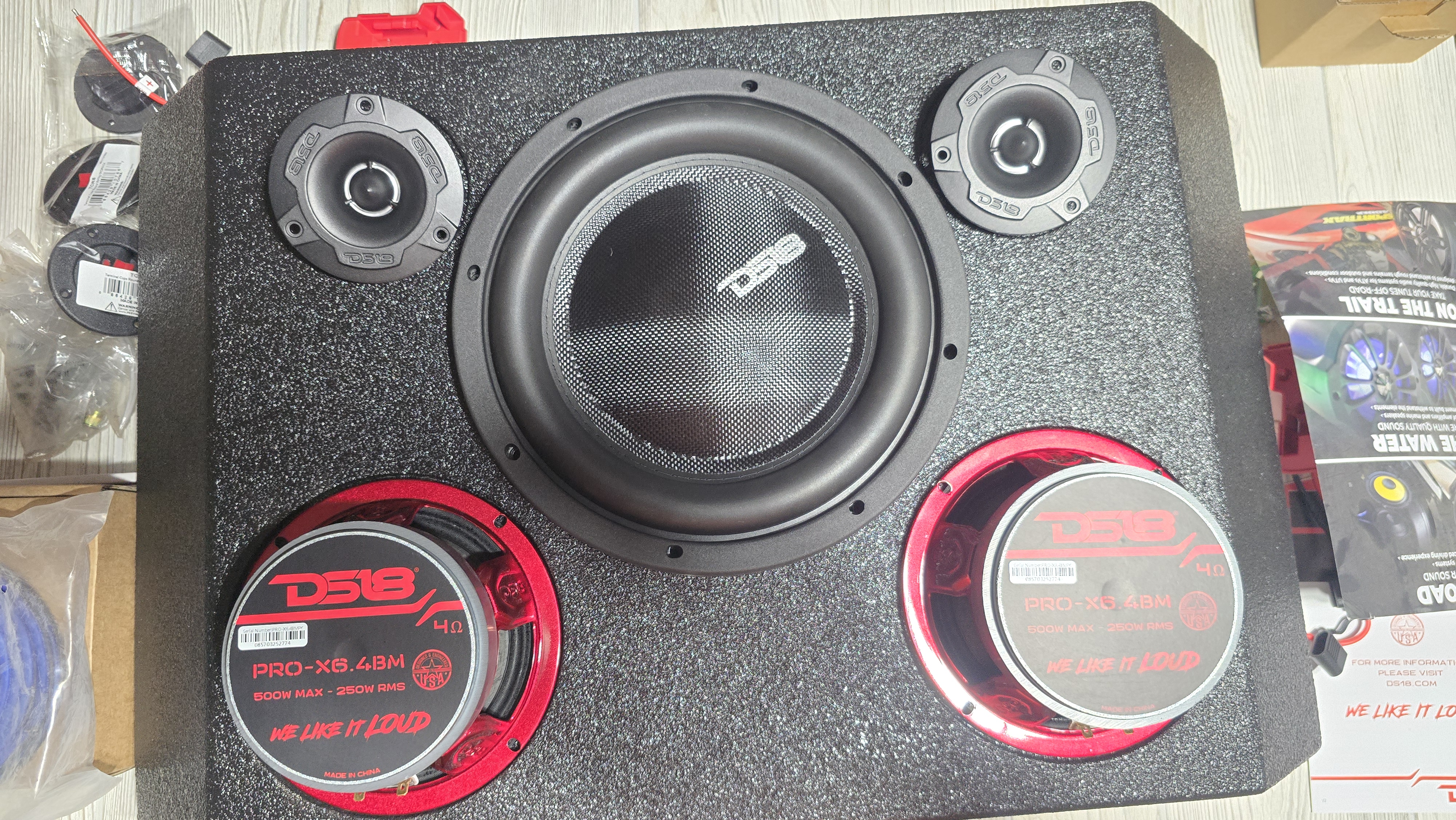 • Houses 10” sub, dual 6.5“ speakers, dual 4” tweeters